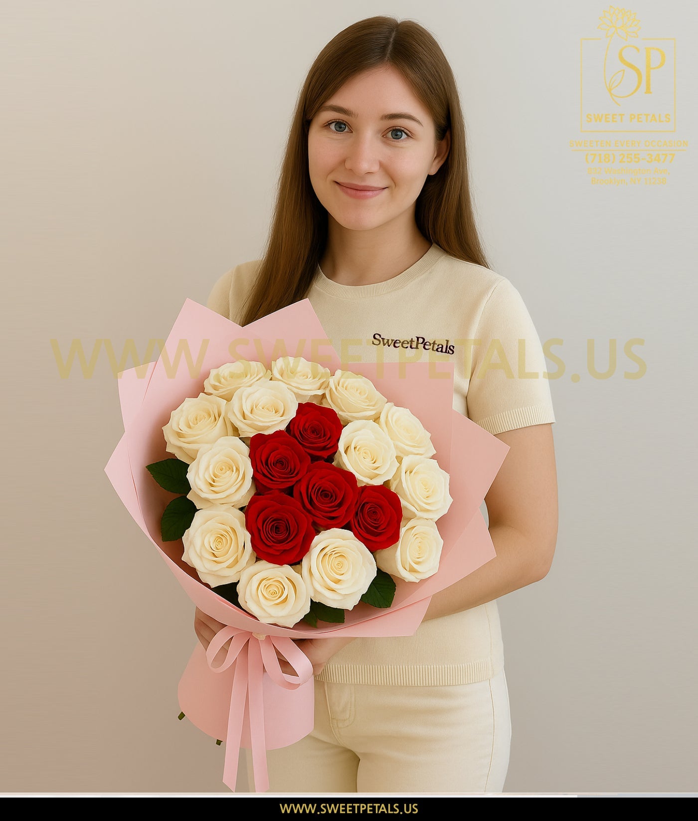 Flowers by SweetPetals – Brooklyn proudly presents the Blush Heart Charm Bouquet, a romantic creation that blends elegance with heartfelt expression. Featuring lush white roses forming the base and radiant red roses shaped into a delicate heart, this bouquet beautifully symbolizes pure love and devotion. Wrapped in soft pink luxury paper, it adds an extra layer of charm and sophistication.