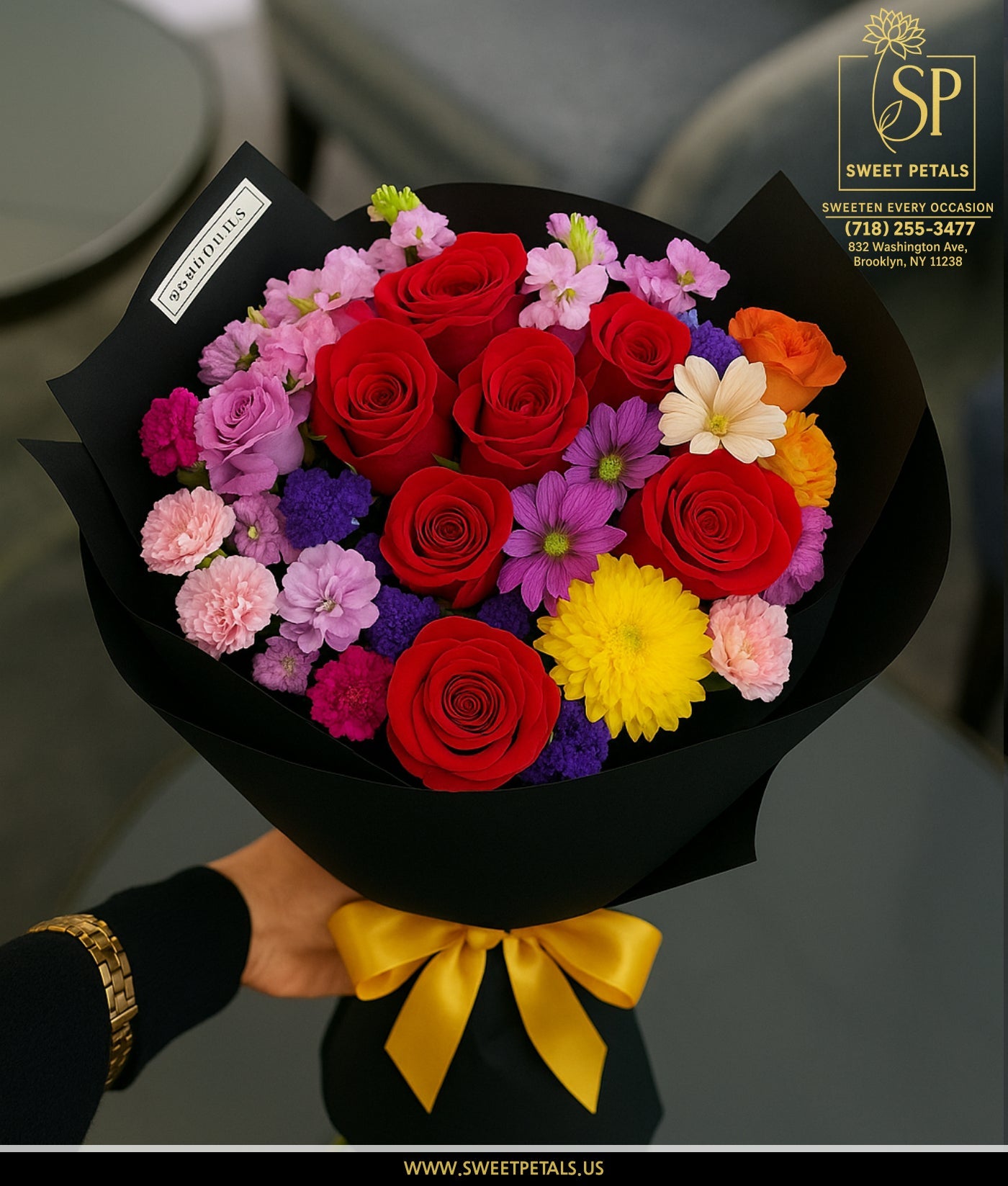 Wrapped in sleek black luxury paper and tied with a golden satin ribbon, the Golden Twilight bouquet by Flowers by SweetPetals – Brooklyn exudes elegance and modern sophistication. Perfect for birthdays, anniversaries, celebrations, or as a grand romantic gesture, every bloom in this arrangement is hand-selected for freshness and beauty, then artistically arranged by our expert Brooklyn florists.