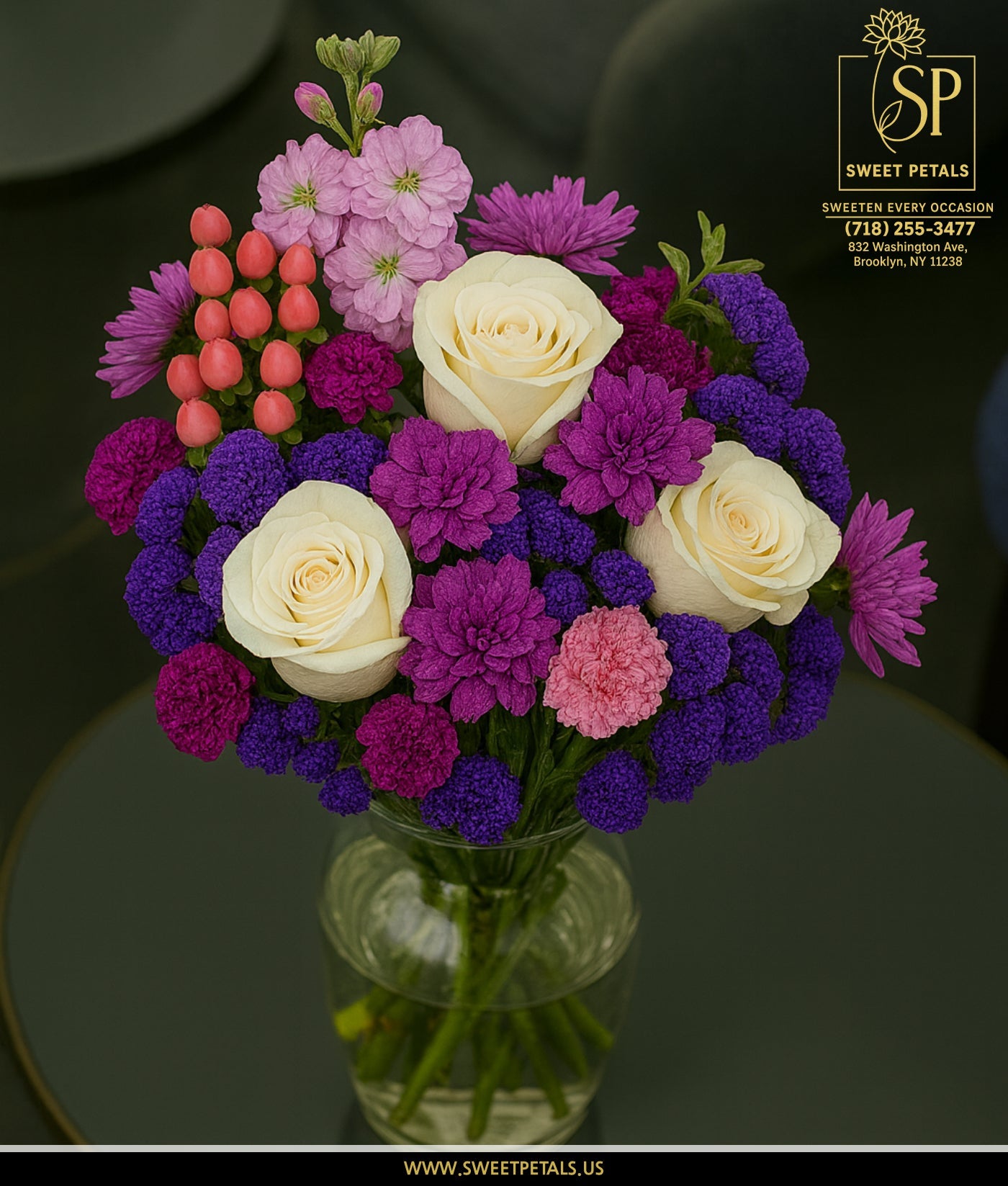Flowers by SweetPetals – Brooklyn proudly presents Ivory Bloom Harmony, a graceful and vibrant vase arrangement designed to bring beauty and joy into any space. This stunning display features creamy ivory roses, vivid purple statice, magenta chrysanthemums, soft pink spray carnations, and cheerful hypericum berries, artfully combined to create a rich and harmonious palette.
