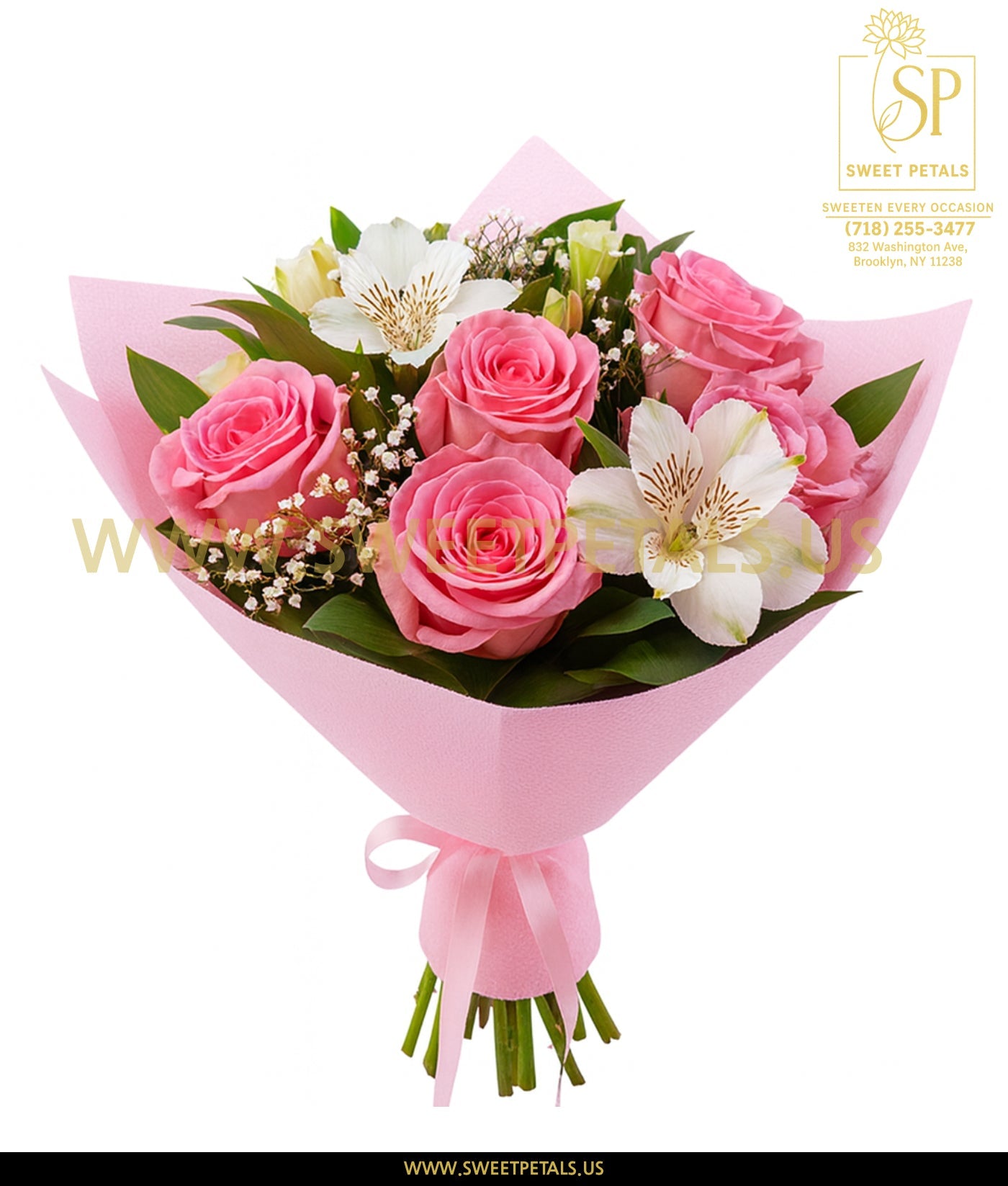 Flowers by SweetPetals – Brooklyn presents Pink Petal Charm, a bouquet that radiates tenderness and grace. This delightful arrangement features blushing pink roses, pure white alstroemeria, and delicate baby’s breath, all nestled among fresh green foliage for a natural, elegant touch.