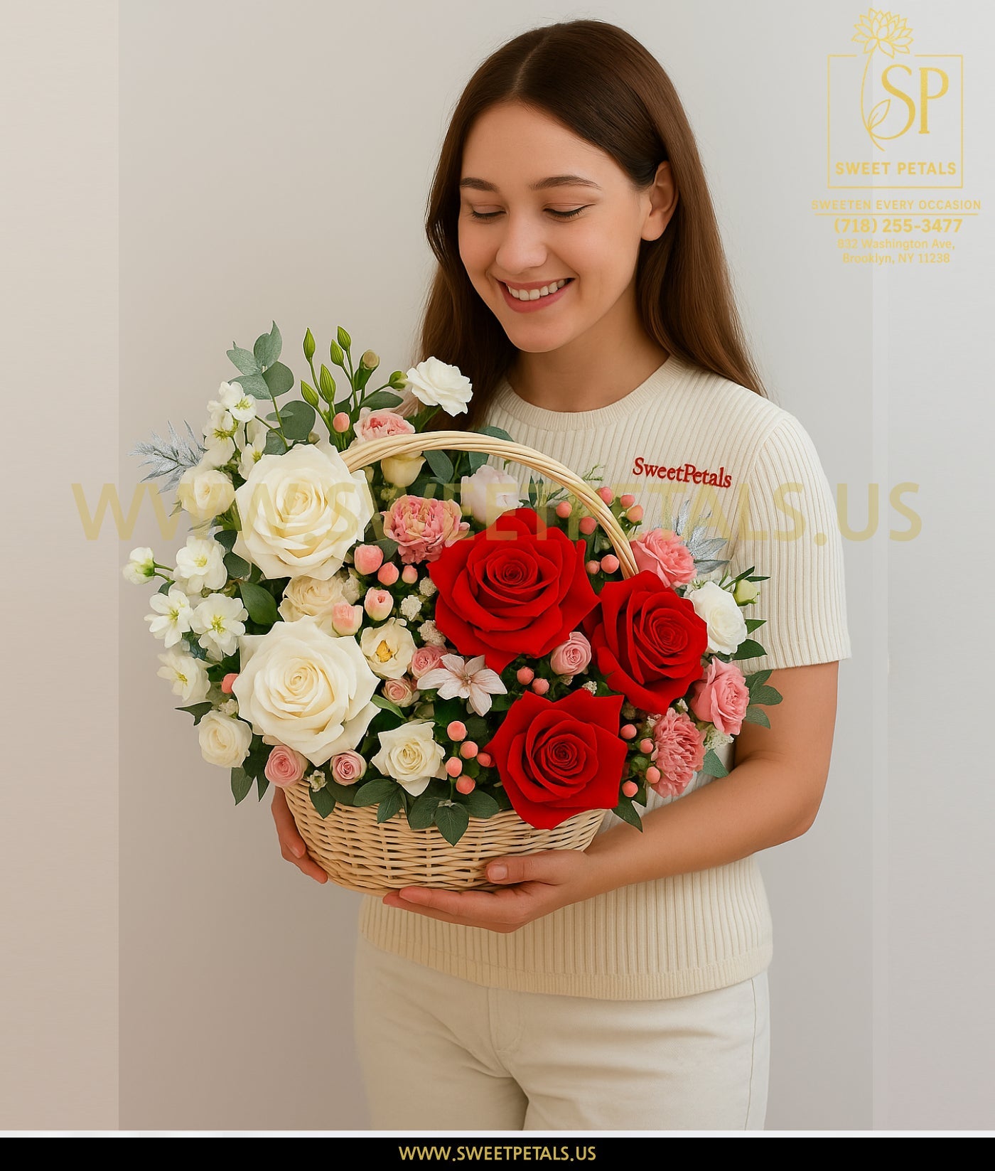 Flowers by SweetPetals – Brooklyn proudly presents Radiant Basket Bloom, a captivating floral basket designed to impress with its vibrant elegance. This exquisite arrangement features velvety red roses, graceful white roses, and delicate pink blooms, artfully accented with fresh greenery and soft filler flowers.