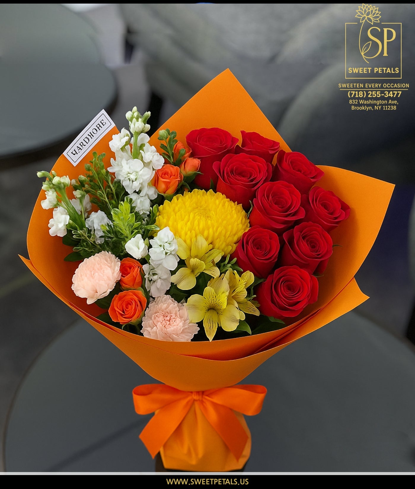 Flowers by SweetPetals – Brooklyn presents Sunset Elegance, a vibrant fusion of romance and warmth from our Luxury Collection. This stunning arrangement combines velvety red roses with bright golden blooms, cheerful orange sprays, and crisp white accents — each stem hand-selected for its freshness, vivid color, and flawless beauty.